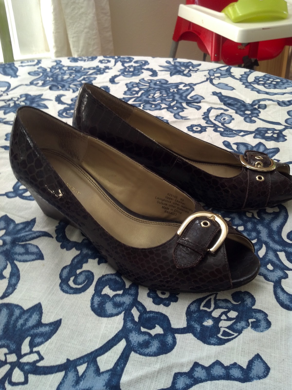 | The piece de resistance: $5 Banana Republic peep toe wedges in brown leather snakeskin. Hellllllll yes. |